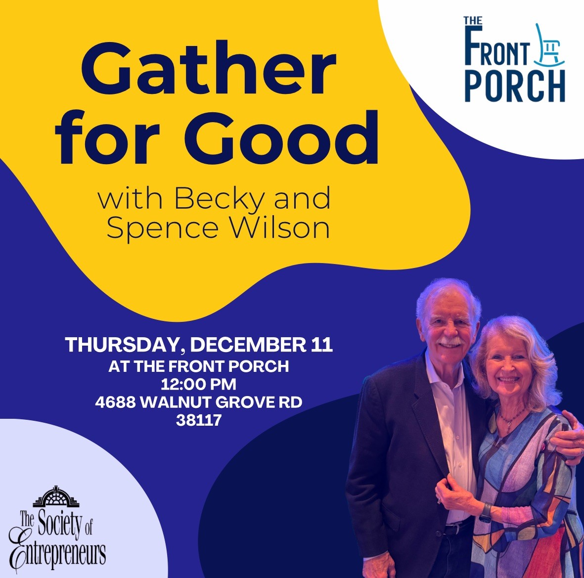 Join Becky and Spence Wilson as they share their vision and the mission of The Front Porch-a place for rest, renewal, and restoring. The Front Porch is more than just a place—it’s a movement to Gather for Good. Nestled on Walnut Grove Road in East Memphis, this welcoming space is designed for the Greater Memphis community to come together—to work, play, rest, and restore. Whether building connections, fostering collaboration, or simply finding a moment of peace, The Front Porch is a center of hospitality for people of all ages, faiths, and backgrounds, dedicated to making Memphis an even greater place for everyone.