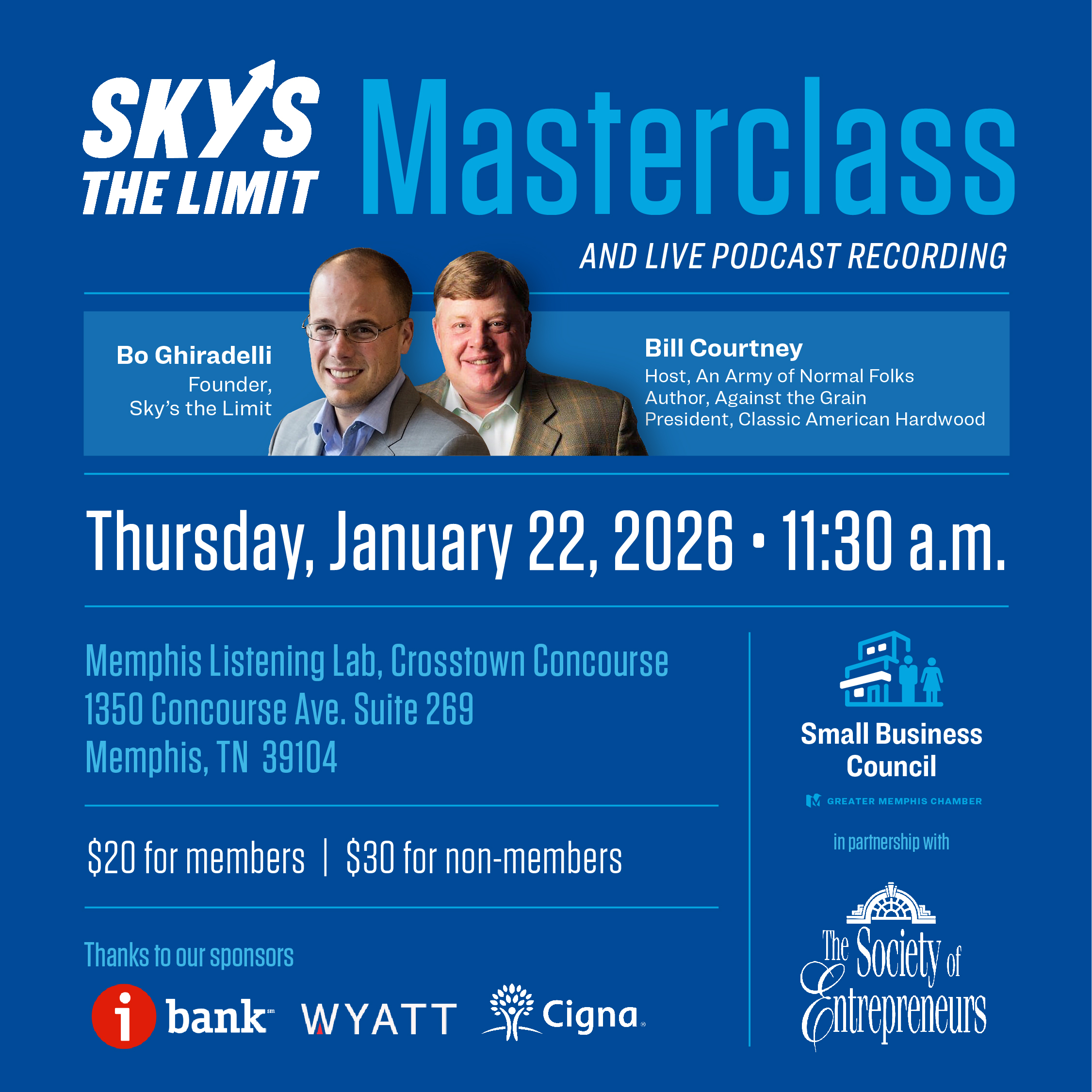 Join us on January 22, 2026 at 11:30 AM for a special live recording of the Army of Normal Folks podcast featuring host Bill Courtney and Bo Ghirardelli, founder of Sky’s the Limit, an app created to Empower Underestimated Entrepreneurs with Free Mentoring, Training & Grants. Held at the Memphis Listening Lab in Crosstown Concourse, this event offers an inspiring look at entrepreneurship, community impact, and the power of ordinary people doing extraordinary things. This unique opportunity to learn, connect, and be energized is presented by The Society of Entrepreneurs and the Small Business Council of the Memphis Regional Chamber.